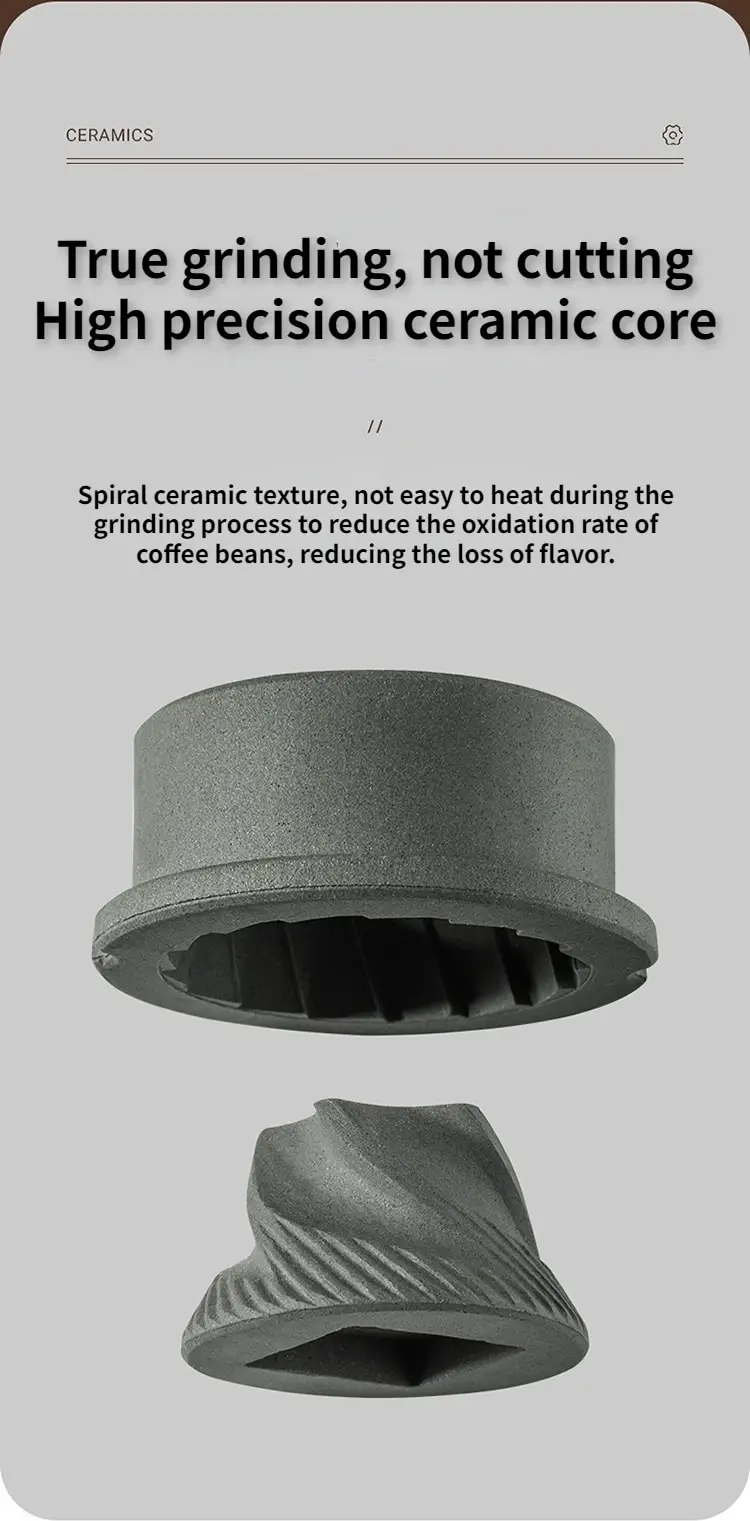 5. True grinding not cutting. High-precision ceramic grinding core, spiral pattern ceramic texture, grinding process not easy to heat, reduce the oxidation rate of coffee beans, reduce flavor loss.