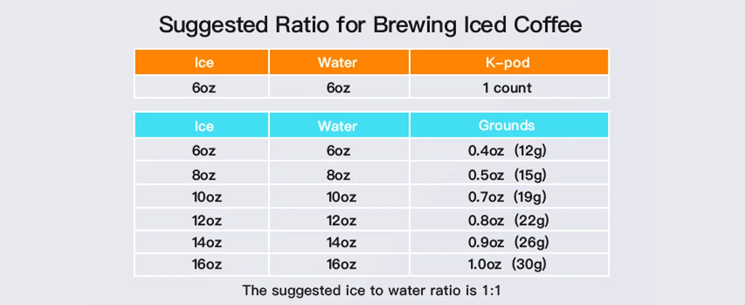 7. Notes: All 4 brew styles deliver hot beverages, varying by concentration and temperature. Ensure to place ice in the mug before selecting "Over Ice" or "Iced Tea", the recommended ratio of ice to water is 1:1